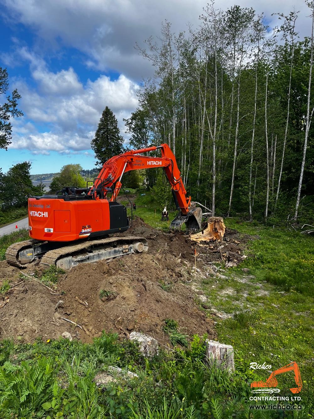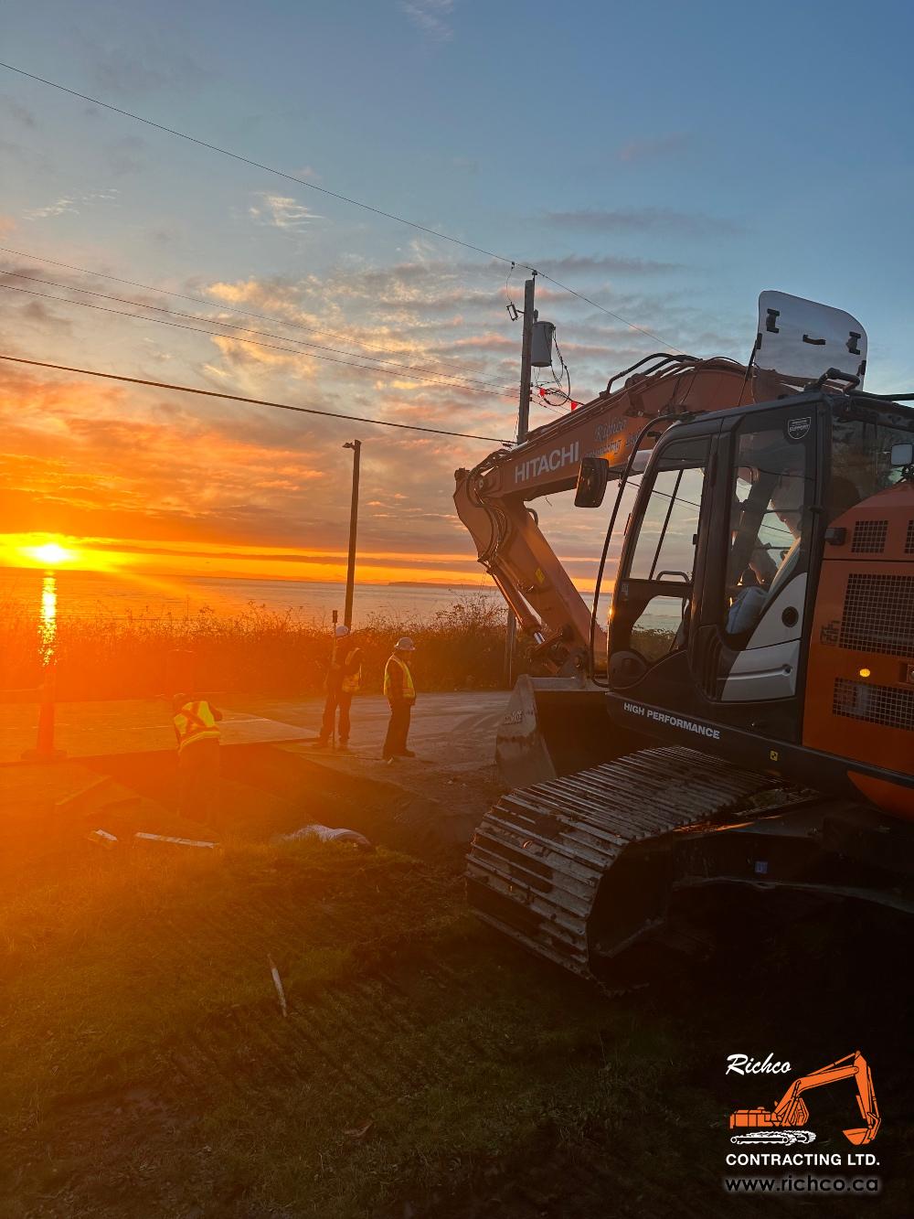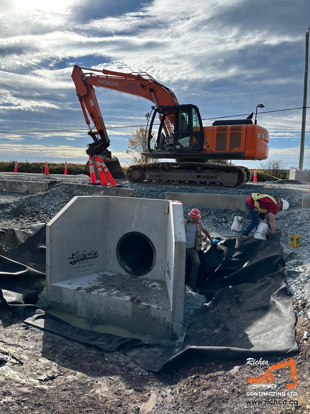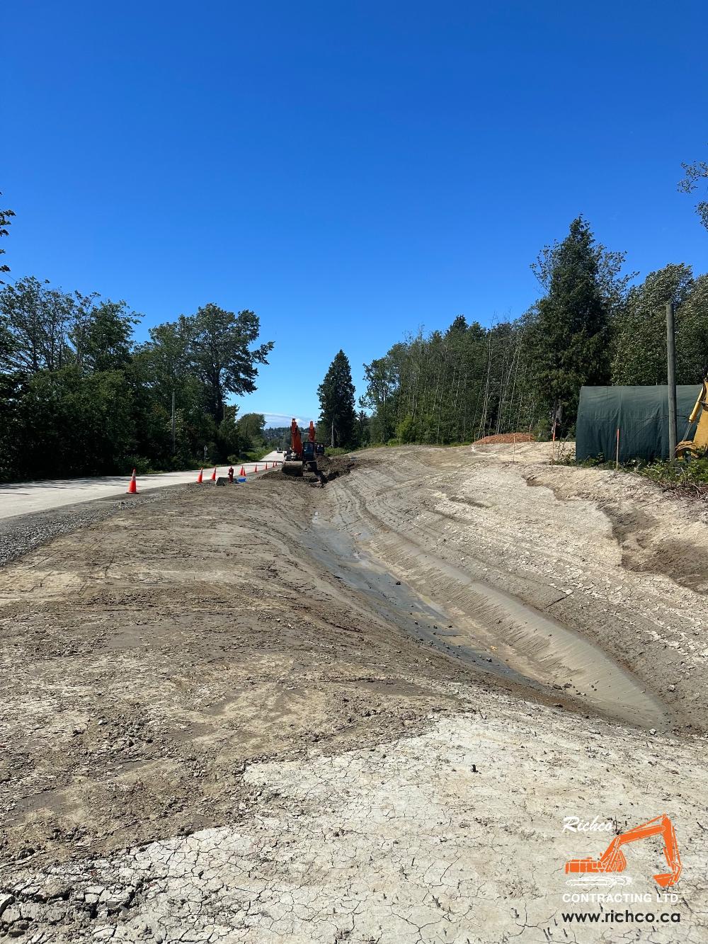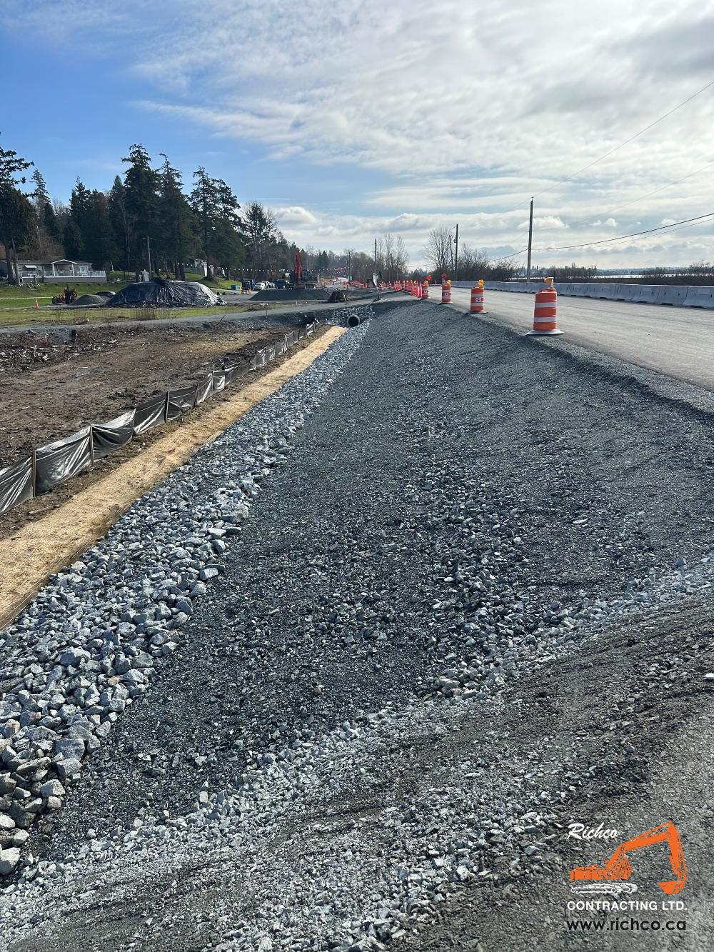 Richco delivered a complex road widening project for the Ministry of Transportation along Beach Road - a Semiahmoo First Nations and archaeologically sensitive site requiring controlled excavation under the continuous supervision of an Archaeological monitor throughout construction. The scope was varied, spanning environmental earthworks, large-diameter HDPE pipe fusion and installation, culvert replacement, preload fill placement, lock block wall construction, and full road restoration including guard rails, barriers, and signage. Spanning nearly a full year from August 2023 to July 2024, the project demanded exceptional crew discipline, regulatory awareness, and the ability to coordinate multiple scopes simultaneously within a culturally protected corridor.