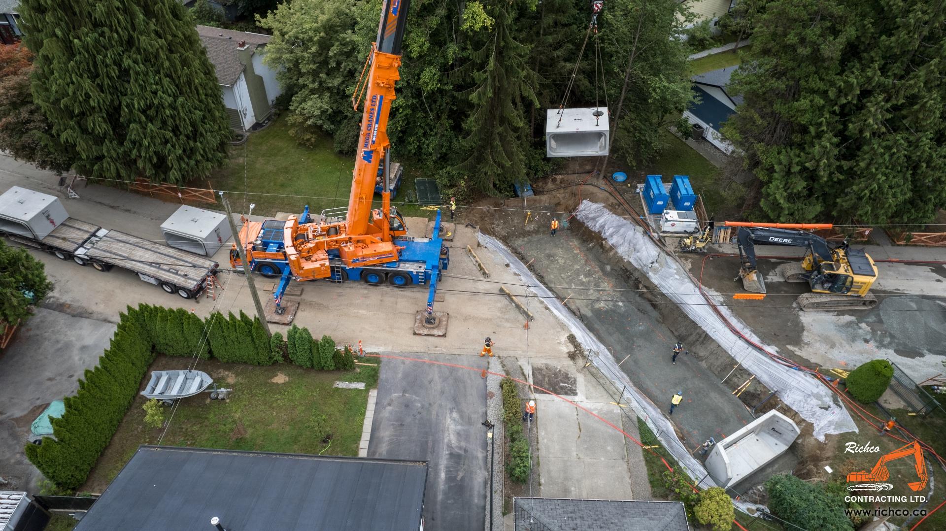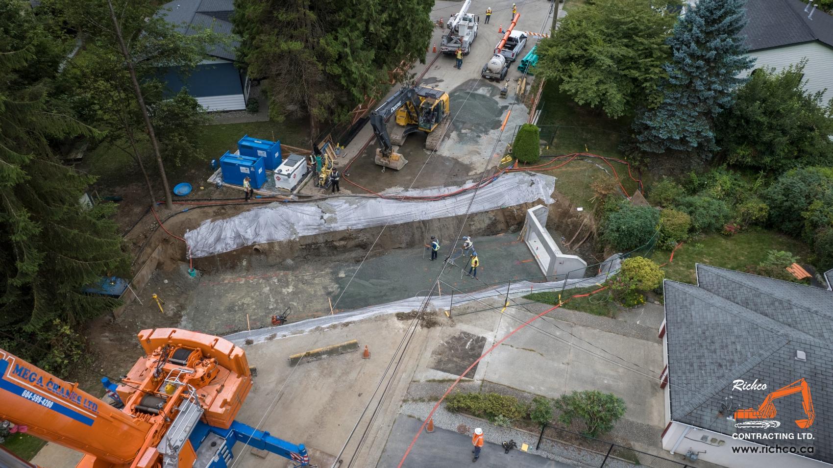Richco delivered a technically layered contract for the City of Maple Ridge — a $3.27M sanitary and storm main replacement spanning 126 Avenue from 216 Street to Grace Street, and continuing north along Grace Street. Beyond the mainline replacements, the project included a culvert renewal at an unnamed tributary to the Alouette River — bringing DFO regulatory considerations, instream environmental protections, watermain rerouting, and landscaping restoration into the scope alongside the core utility work. The combination of urban road corridor utility replacement and live watercourse crossing work within a single contract reflects the breadth of civil capability Richco brings to complex municipal programs.